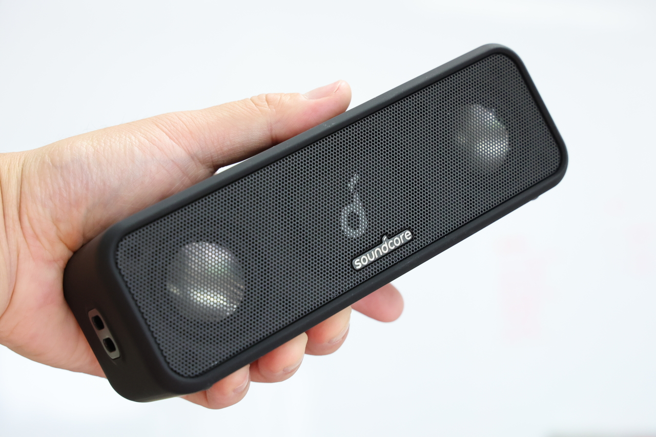 Soundcore3は全体的にマット塗装されており、高級感こそ無いものの安っぽさもそんなに無い。正面のSoundcoreロゴや、メッシュの奥に見えるアイコンやスピーカーが控えめに主張していて良い感じ。