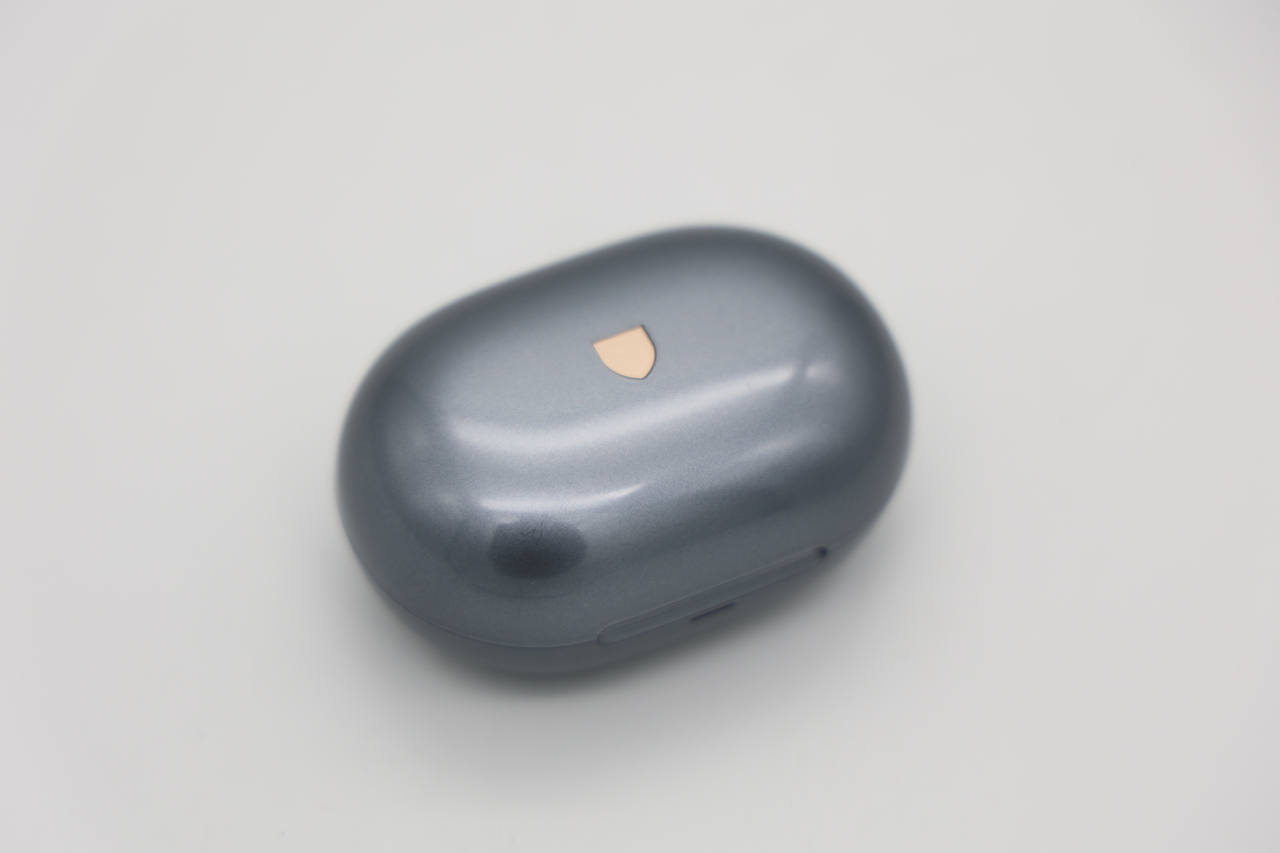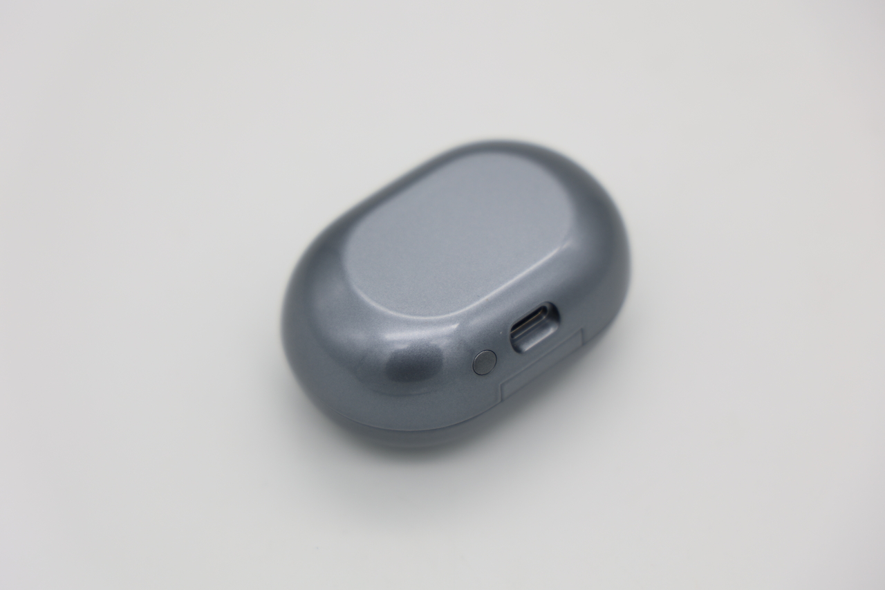 グレーメタリックの充電ケースは十分に小型軽量。以前レビューしたSOUNDPEATS Mini Pro HSの充電ケースはあからさまに小さかったのでそれに比べると一回り大きいが、有線イヤホンと比べればむしろ小さいぐらい。片手に十分収まるサイズ感。重量も実測55gと軽量。
