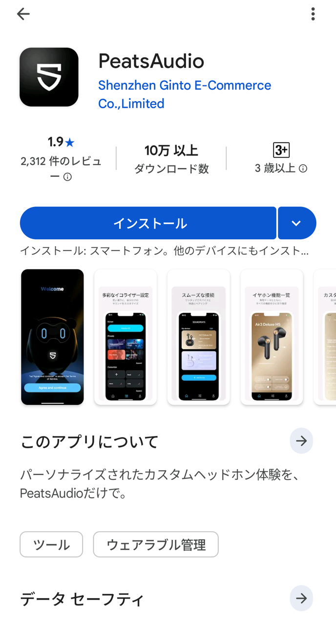 SOUNDPEATS Clip1の機能をフルに活かすには専用アプリ「PaetsAudio」をスマートフォンにインストールする必要がある。今回はAndroid版アプリを使用した。