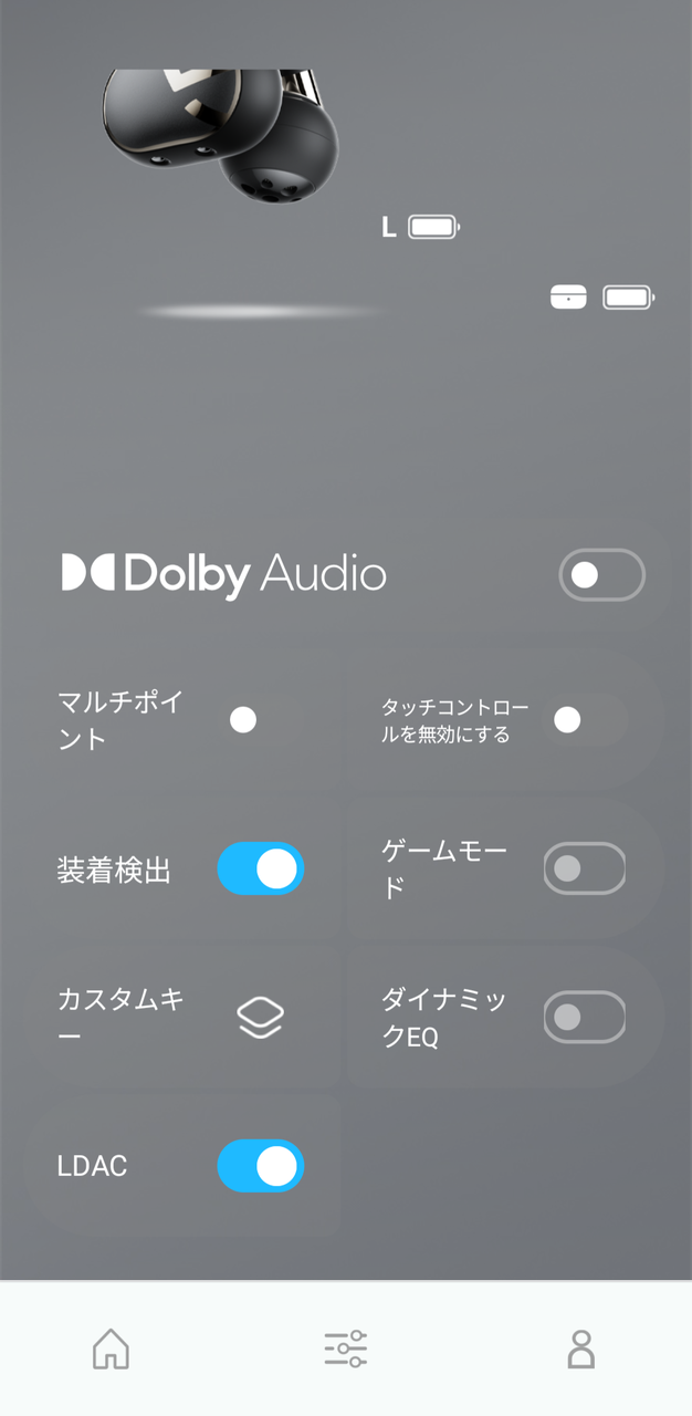 の8項目を設定可能。ただしLDACをONにするとDolby Audioとマルチポイントとゲームモードが使えなくなる。