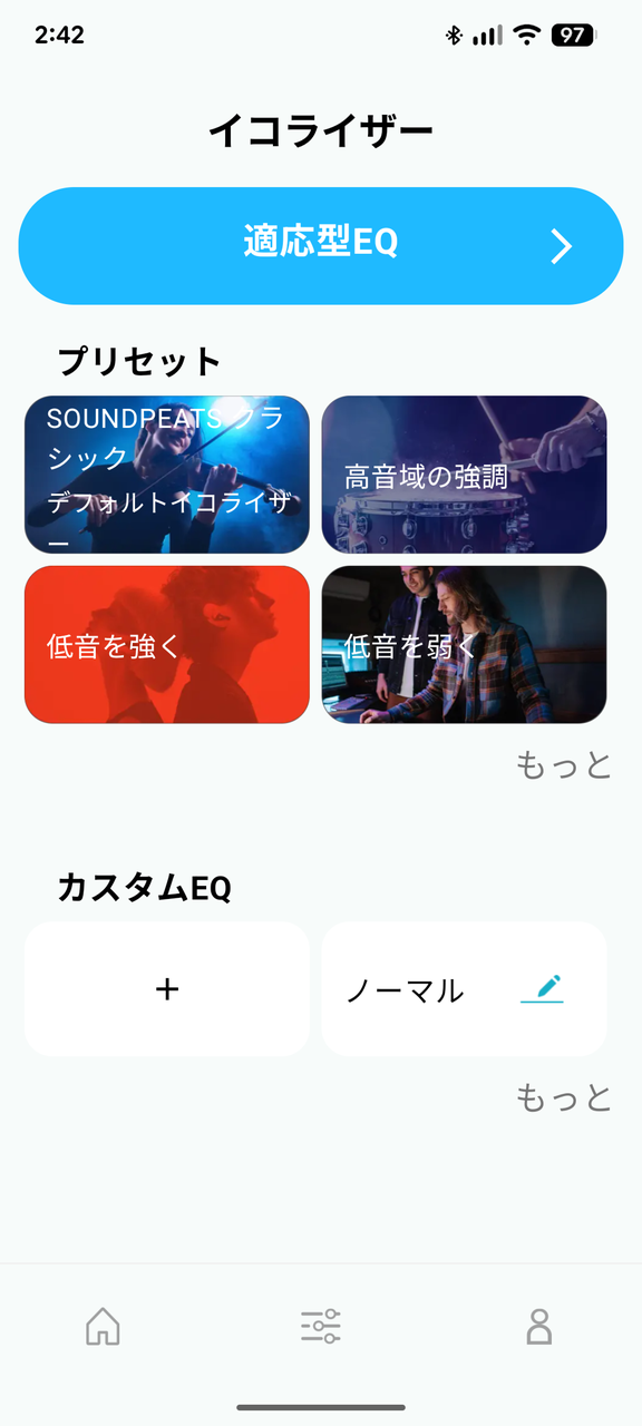 イコライザーは自分の耳の聞こえに合わせて調整できる「ダイナミックEQ」やプリセット、さらにカスタムイコライザーまで様々設定できる。なぜかデフォルトのイコライザーに戻すという選択肢が無いのが不思議だが、ある程度好みの音質に調整はできる。いくつか試してみたが、個人的にはデフォルトのままでいいと思う。