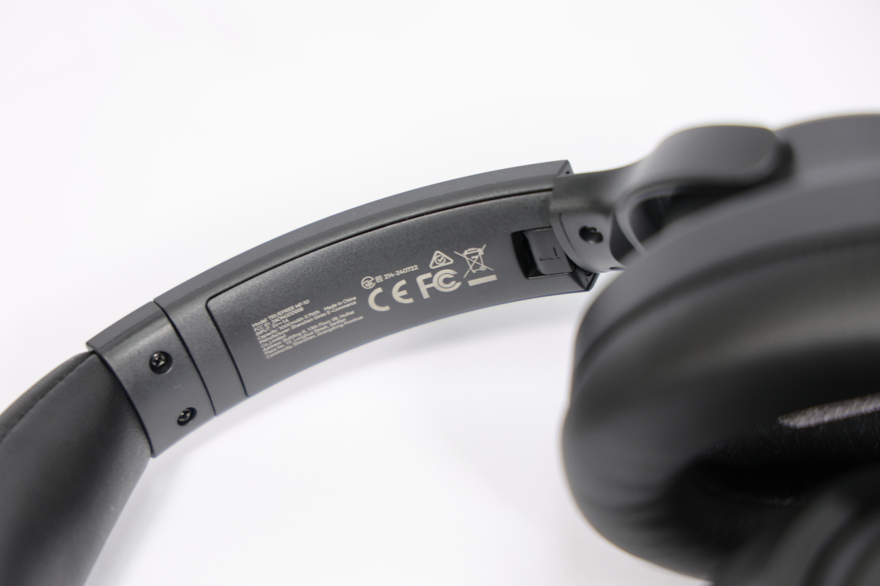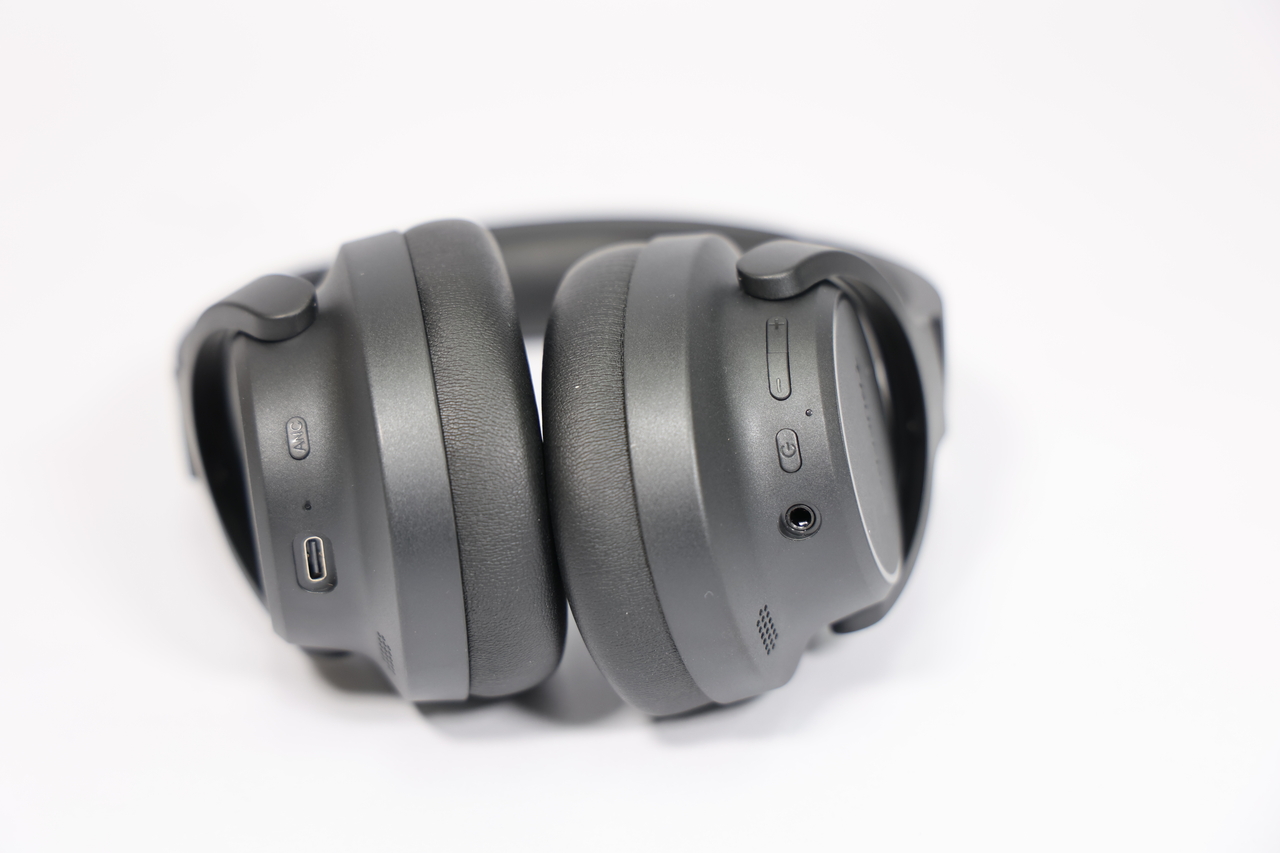 操作系はイヤーマフ下部に集中している。右耳にはAUX端子とでんg年ケーブル、音量ボタンがあり、左耳には充電用USB端子とANCボタンが備わる。ボタンはクリック感がしっかりあるのでわかりやすい。