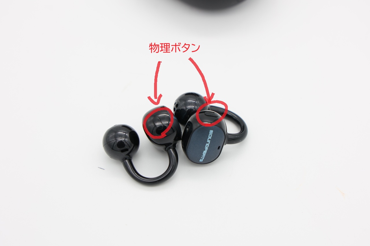 このイヤホン、物理ボタンが搭載されており、音量調整や曲送りはこのボタンを操作することで可能となっている。物理ボタンは各イヤホンに1個だけで、耳に装着するとボタンが両方上になるか両方下になるかの2通りの装着パターンになる。