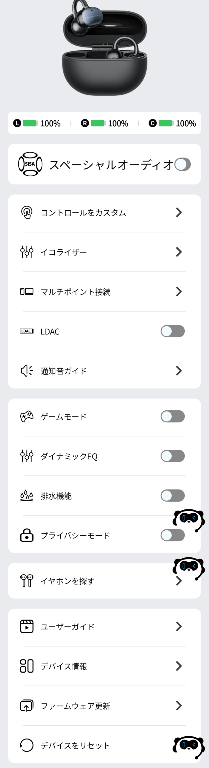 製品を登録するとこのようにイヤホンの充電状況や各種設定が行える。